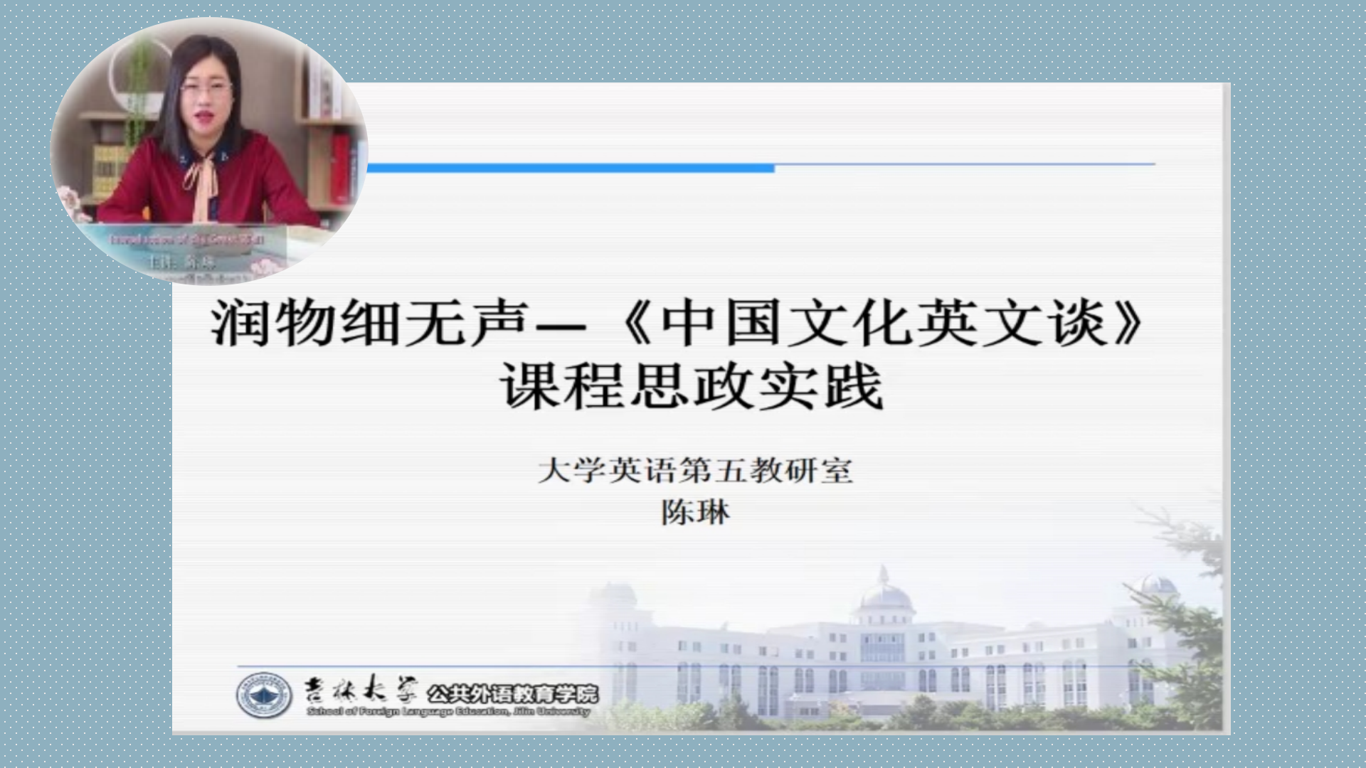 陈琳老师的报告题目为:“润物细无声—《中国文化英文谈》课程思政实践”。报告主要包括四个方面的内容。首先陈老师阐述了个人对于课程思政的理解,认为课程思政在宏观层面是教育教学理念,在中观层面涉及课程观,在微观层面则是具体的教学方发和实践。第二部分内容是“外语教学中的课程思政”,主要阐述个人对于外语教学所承担的立德树人使命的理解。第三部分陈老师从《高等教育思政建设纲要》以及《大学英语教学指南》中关于中国文化类英语课程建设的指导性内容出发,阐述设立《中国文化英文谈》课程的意义。最后的内容是《中国文化英文谈》课程思政实践的呈现。陈琳老师以“故宫”这一知识点为例,展示了她基于“产出导向法”设计的教学目标及教学流程。陈琳老师认为,外语课程要将知识传授,能力培养及价值塑造融为一体,潜移默化引导学生形成社会主义核心价值观,真正做到“润物细无声”。