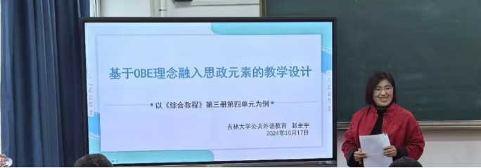 随后,赵金宇老师以大学英语第三册第四单元为例,结合OBE教育理念为老师老师们呈现了一堂生动的教学示范课。赵老师详细展示了第四单元的教学设计思路、课堂教学活动、课堂后的教学延伸、学生的反馈方法以及如何将思政元素自然融入课程设计。赵老师的分享充满激情,极具感染力。