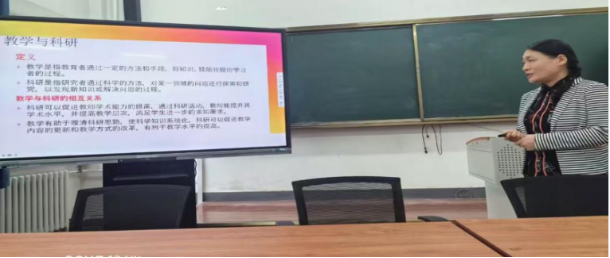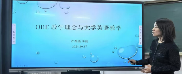 接下来,李楠老师对OBE教学理念进行了阐释,将OBE理念中的实施要素与大学英语教学的教学目标、教学手段、评价方法相对应,使在座的教师明确了OBE理念的涵义和实施要点。同时李老师以大学英语第三册第四单元为例,展示了如何在OBE理念的指导下进行单元教学设计。这为在座的教师们今后在教学设计中应用OBE教育理念提供宝贵灵感。