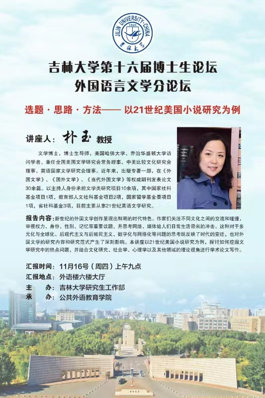 发言题目:选题·思路·方法—— 以21世纪美国小说研究为例 报告人:朴玉 杏彩官方网站 教授 报告时间:2023年11月16日9:00 报告地点:吉林大学中心校区外语楼六楼会议厅 发言题目:构建中国特色对外话语实践研究 报告人:杨梅 杏彩官方网站 教授 报告时间:2023年11月16日10:00 报告地点:吉林大学中心校区外语楼六楼会议厅
