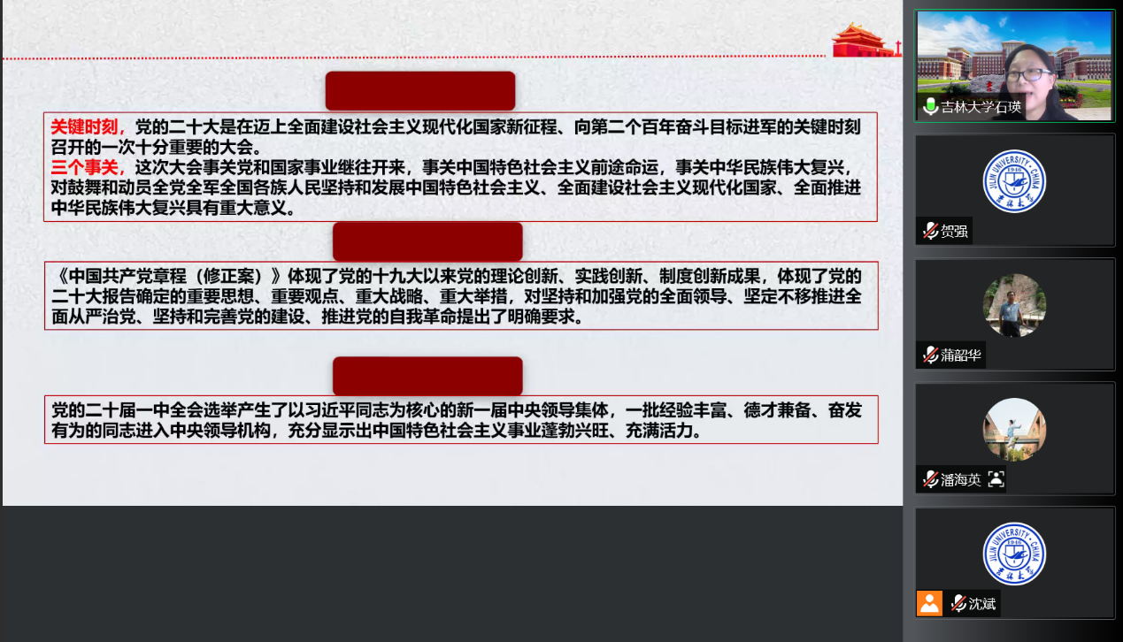为深入贯彻落实《吉林大学深入学习宣传党的二十大精神工作方案》,根据学院学习贯彻党的二十大精神工作安排,1125日下午,公共外语教育学院举办了学习贯彻党的二十大精神专题讲座。讲座邀请吉林大学党的二十大精神宣讲团成员、马克思主义学院副院长石瑛教授对党的二十大精神作专题辅导。学院领导班子成员、全体教工、学生党员及全体机关管理团队人员共计二百余人参加了本次宣讲报告会。会议由学院党委书记贺强主持。