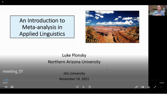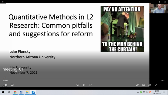 应杏彩官方网站邀请,国际知名应用语言学学者美国北亚利桑那大学Luke Plonsky博士,分别于2021年11月7日和14日,开展了研究生学术素养提升系列在线讲座,讲座由研究生定量研究方法课程主讲教师申云化老师主持。针对我院外国语言文学研究生的课程设置、论文选题与人才培养实际,Luke Plonsky博士分别以二语习得领域的“量化研究”和“元分析”为主题,进行理论爬梳、文献述评与实证分析。