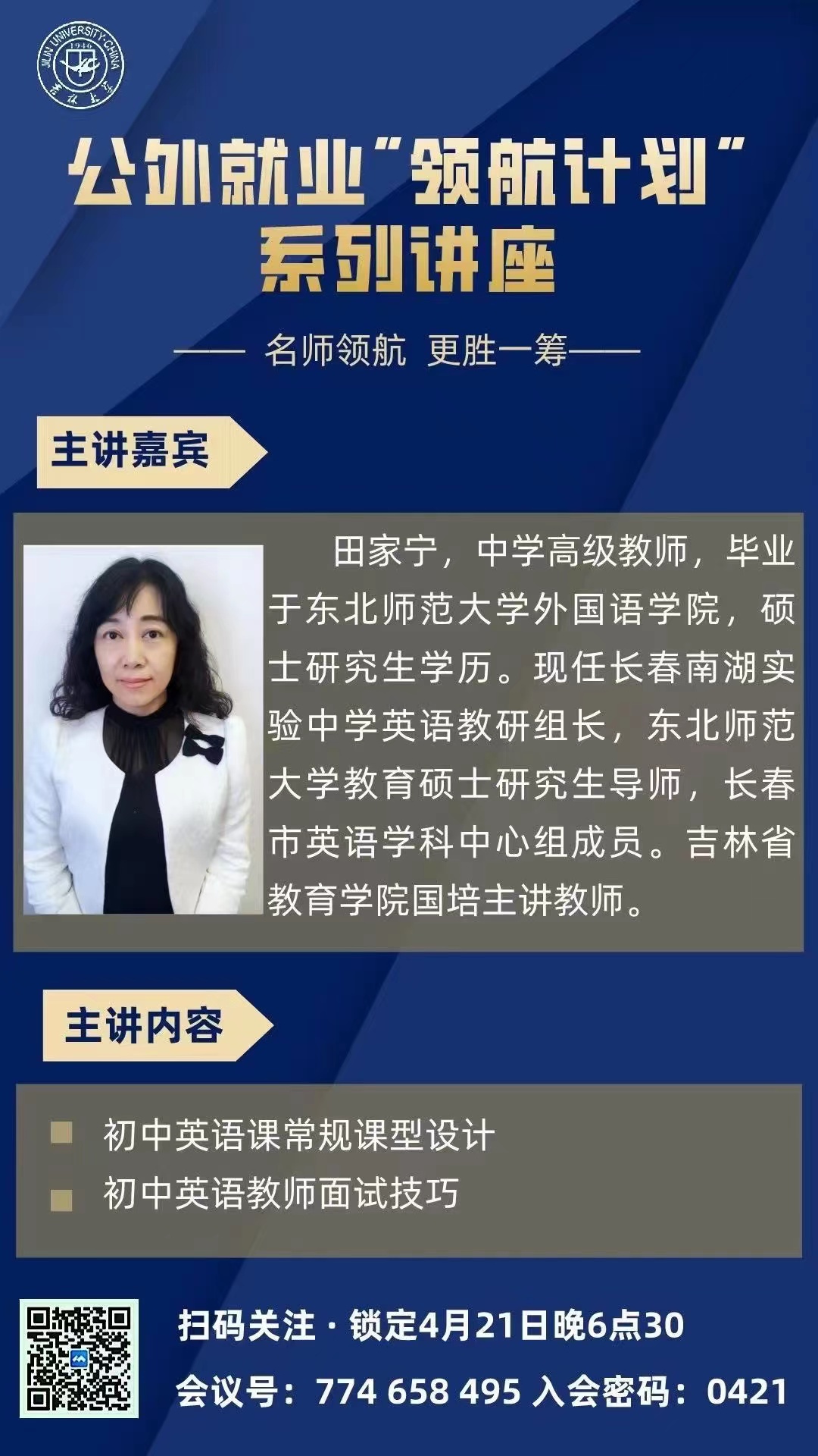 本次分享会特邀长春市英语教学名师——田家宁老师,结合自己二十年多年来的教学经验为同学们进行了职业分享。会议由学院研究生辅导员曾媛主持,校内外200余名同学参会并进行深度交流,反响十分热烈。