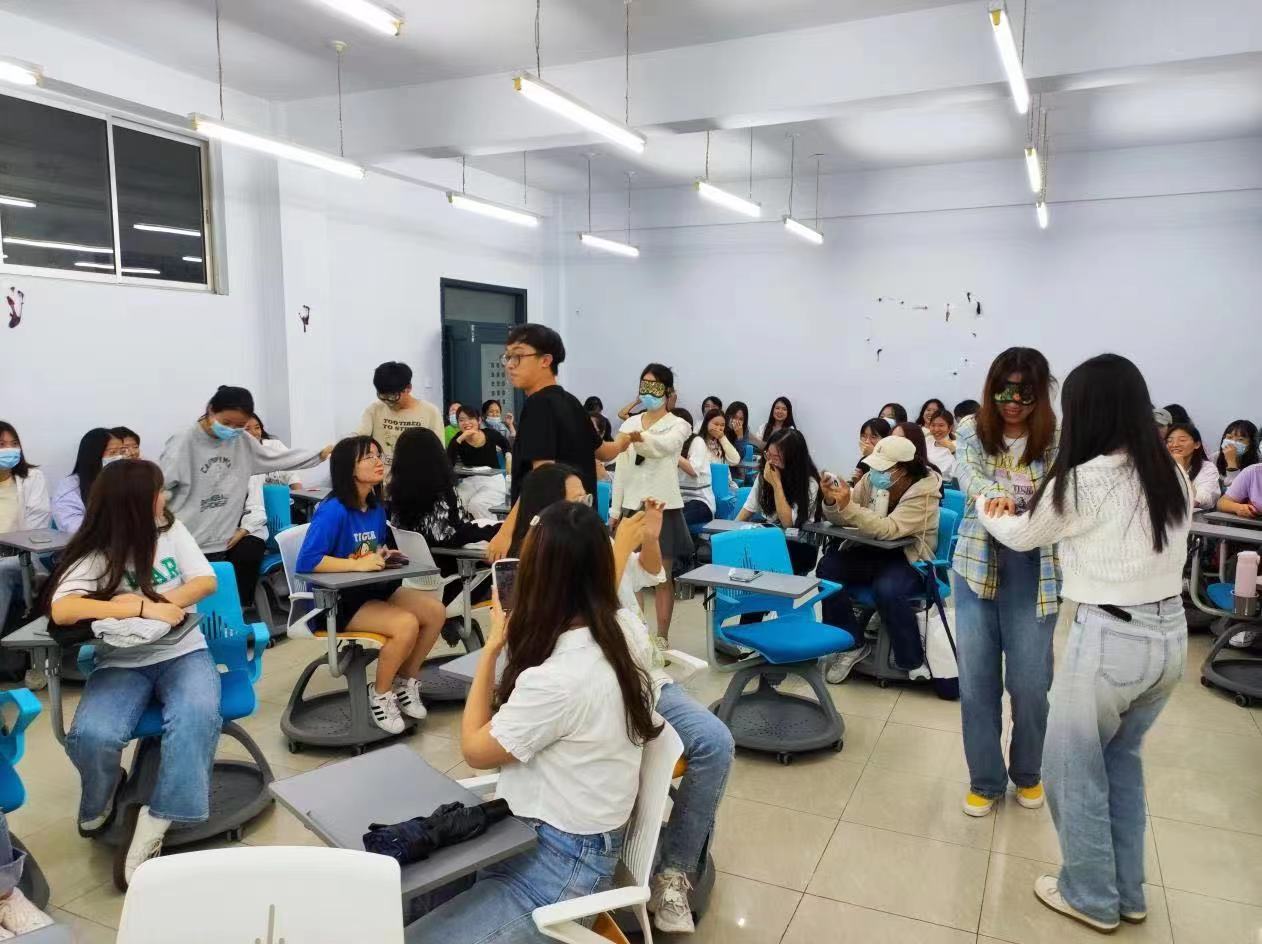 过渡阶段,“你比我猜”将整场活动的气氛推向了高潮。赛后,主持人为参赛全体同学设置了颁奖仪式,在慷慨激昂的音乐下,主持人按照成绩为参赛选手发放奖品。随后的“信任之旅”游戏成为了破冰行动的关键,在引路人的指导下,戴上眼罩的“盲人”绕过障碍抵达终点,并在摘下眼罩的那一刻,找出自己的引路人。在活动的末尾,建立起信任关系的同学们在轻松的氛围中发出了掌声。