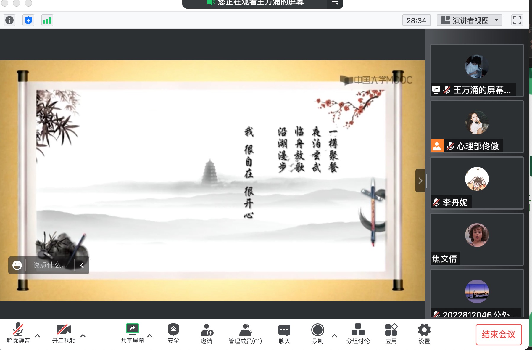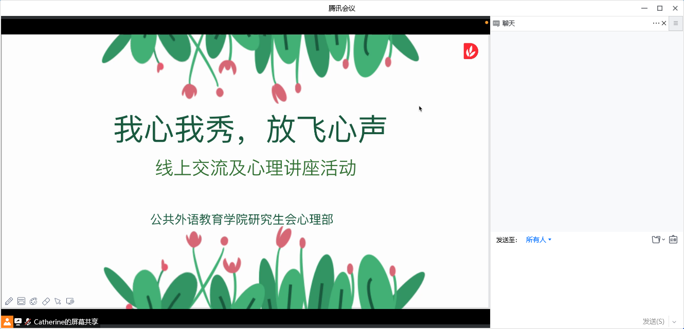 为帮助同学们适应新环境,平衡学习和生活的压力,消除同学们在抗击疫情中产生的情绪与心理压力,2022年11月23日公共外语教育学院研究生会心理部在腾讯会议平台举办了“朋辈协力·心理成长”系列活动---“我心我秀,放飞心声”线上交流及心理讲座活动。该活动由学生心理健康指导中心和学院心理辅导员指导,心理部成员主持,全体新生参与。