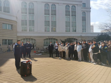 随后,警报响起,同学们有序地从安全通道撤出大楼。在广场上,保卫处的工作人员向大家一一演示了防毒面具、灭火毯及两种灭火器的用法,并鼓励同学们亲身体验如何使用各种消防器材。在演练过程中,同学们认真学习,密切配合。