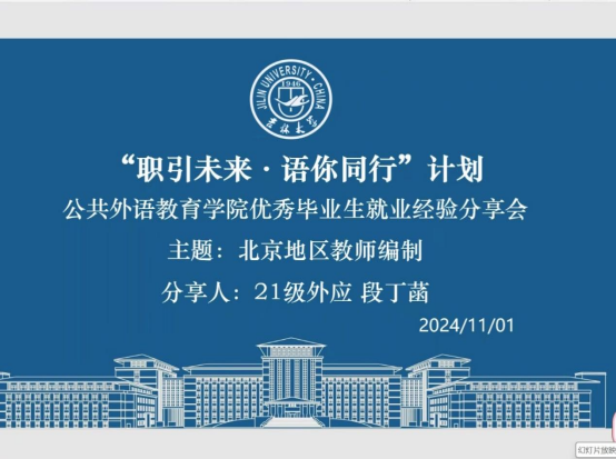 为帮助学院研究生深入了解北京地区教师编招聘现状,切实提升求职竞争力,为未来就业做好合理规划,2024年11月1日晚,公共外语教育学院举办“职引未来•语你同行”——北京地区中学教师编就业经验分享会。此次会议由学院就业兼职辅导员张明珠负责主持,学院2024届毕业生段丁菡主讲,研究生辅导员林明帅和各年级研究生同学线上参会。
