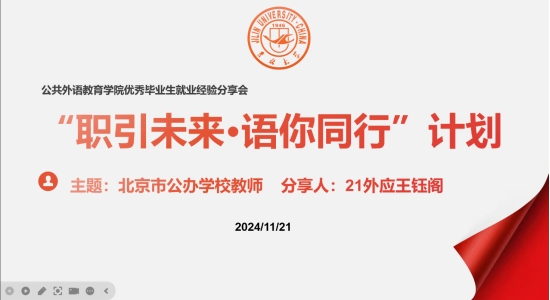 为帮助学院研究生更好掌握北京地区公办学校教师招聘的最新动态、有效提升求职实力、增强职业规划意识,2024年11月21日晚,公共外语教育学院举办“职引未来•语你同行”——北京市公办学校教师就业经验分享会。此次会议由学院就业兼职辅导员张明珠主持,学院2024届毕业生王钰阁主讲,研究生辅导员林明帅和各年级研究生同学线上参会。